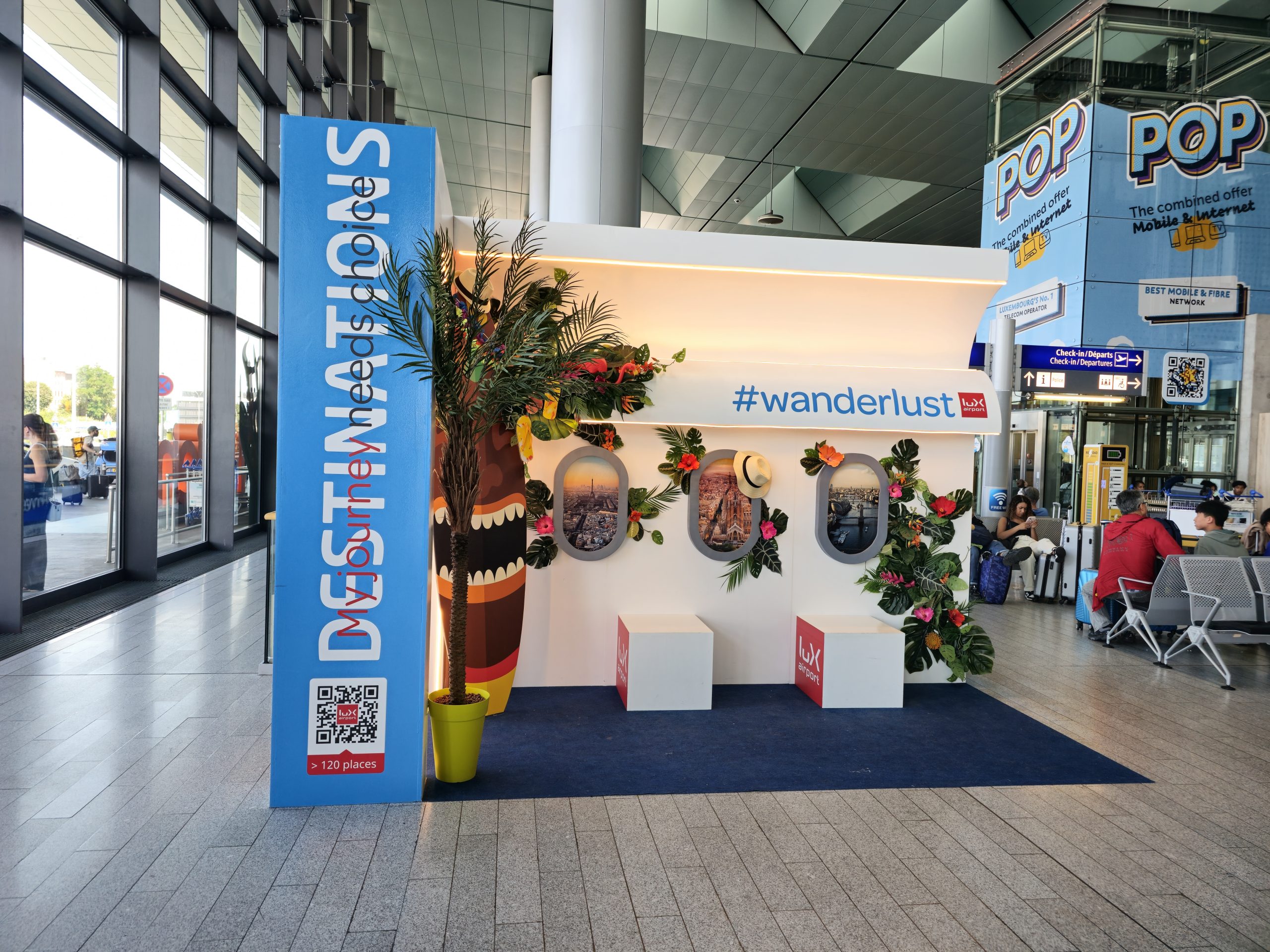 À l’extérieur avec par exemple des bâches, panneaux, totems lumineux ou marquages au sol.